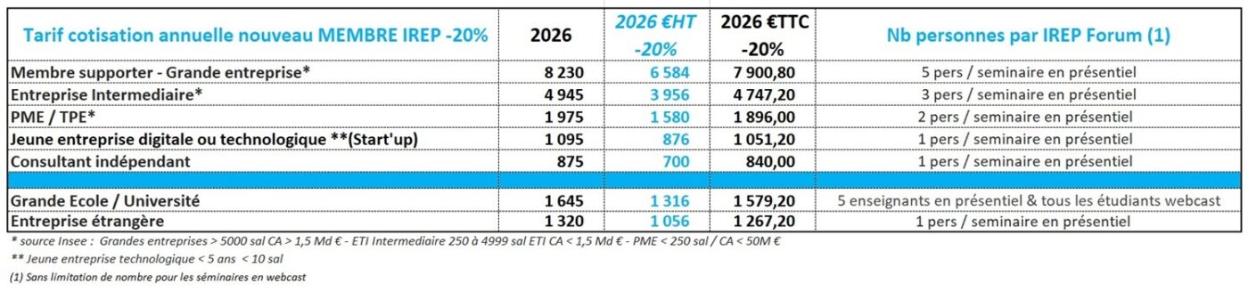 Membre IREP : l’accès aux IREP FORUM est inclus dans votre adhésion annuelle (pour 1 à 5 participants de votre entreprise selon votre cotisation).